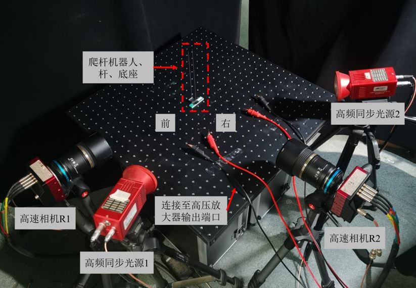 先将压电驱动器的导线连接至高压放大器输出,连接时要使两个压电驱动器的电场方向相同,即在同一时刻,两个压电驱动器的两侧电压同为上正下负或者上负下正的状态。然后将两个高速相机的拍摄帧数设置为3600帧/s,画幅大小为384×680,启动高速相机开始拍摄记录后,再启动函数发生器和高压放大器输出交流电压,调节频率值为380~430Hz,观察到爬杆机器人成功实现了在杆上的迅速攀爬,同时机器人的上升过程图像通过高速相机拍摄并上传到电脑上保存,实验示意图以及实物图见图2、图3。