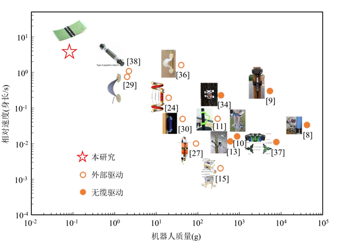 性能对比:在100g以下微型机器人中,相对速度(3.64身长/s)最大,质量(82mg)最小,优于传统仿尺蠖/轮式爬杆机器人,对比图见图5。