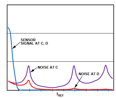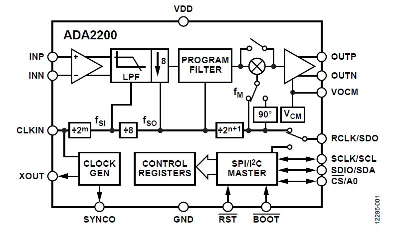 RCLK 用来激励传感器,相当于调制的过程,传感器信号经过放大器缓冲单端进入ADA2200进行IQ双相位解调;值得注意的是ADA2200内部并非通