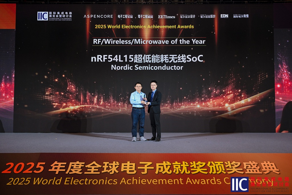 在由全球电子技术领域知名媒体集团 AspenCore 主办的 “国际集成电路展览会暨研讨会”(IIC Shenzhen 2025)颁奖盛典上,Nordic Semiconductor 旗下 nRF54L15 超低功耗无线系统级芯片(SoC)凭借在射频技术创新、多协议兼容性及超低功耗表现上的卓越实力,荣膺 “全球电子成就奖”(World Electronics Achievement Awards)之 “年度射频 / 无线 / 微波产品奖”。该奖项由 AspenCore 全球资深产业分析师评审委员会及亚、美、欧洲地区网站用户群共同评选,是电子产业领域极具权威性的荣誉,充分印证了 nRF54L15 在推动全球无线通信技术创新与物联网产业发展中的领先地位。