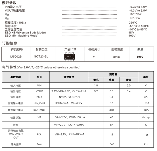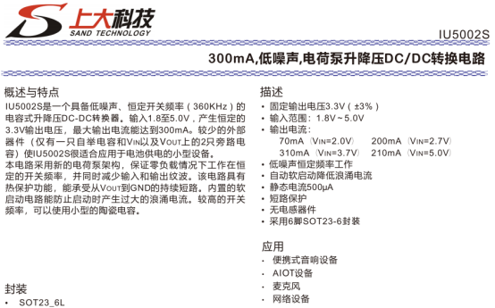 IU5002S是一款低噪声电容式升降压DC/DC转换器,采用SOT23-6L封装,输入电压范围1.8~5.0V,固定输出3.3V(±3%),最大输出电流310mA(3.7V输入),适配便携式音响设备、AIOT设备、麦克风、网络设备等电池供电小型产品,外围器件精简,仅需自举电容和输入输出旁路电容即可工作。