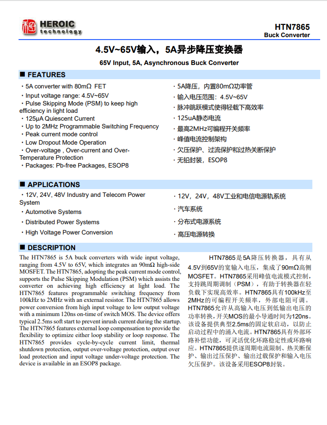 在工业控制、汽车电子、分布式电源等领域,电源转换器的宽压适配、大电流输出与高可靠性直接决定系统性能。禾润 HTN7865 作为一款高集成度降压 DC/DC 转换器,凭借 4.5V~65V 宽输入电压范围、5A 大电流输出及全面保护机制,成为工程师应对复杂电源场景的优选方案。