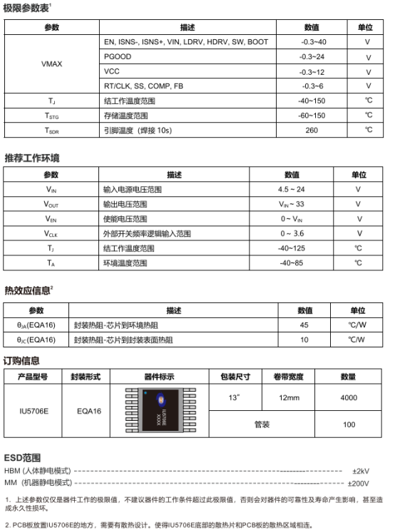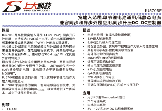 IU5706E是一款宽输入范围同步升压DC-DC控制器,采用EQA16封装,适配单节锂电池及4.5~24V输入场景,最大输出33V,支持同步/异步外围应用,主打高集成、高效率与低成本,适用于Thunderbolt端口、汽车电源、电池供电系统等多电压总线电源场景。