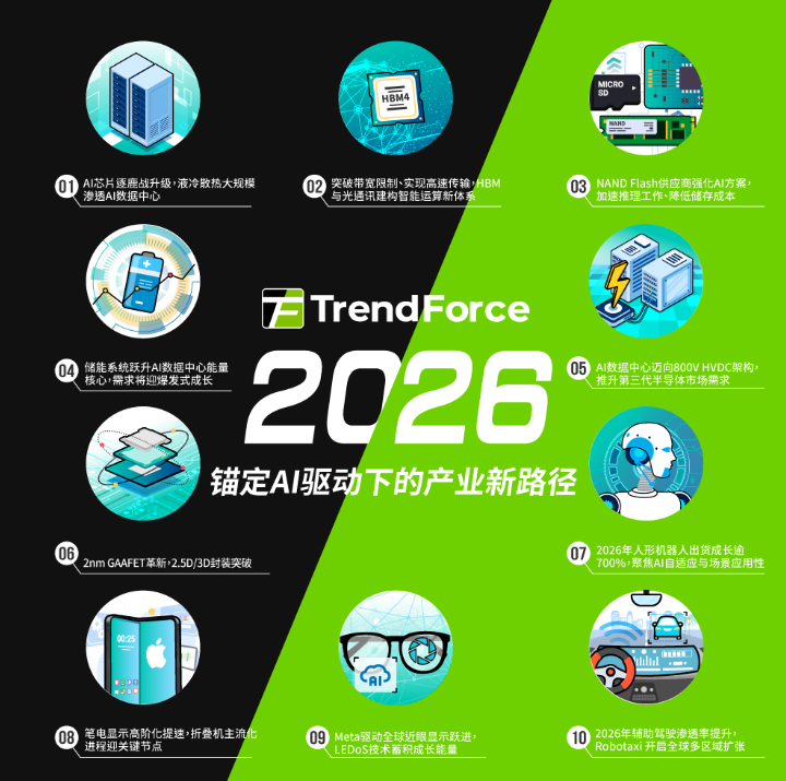 2025年11月27日,由全球高科技产业研究机构TrendForce集邦咨询主办的“MTS 2026存储产业趋势研讨会”在深圳举办。会上,TrendForce集邦咨询发布了“2026十大科技市场趋势预测”: