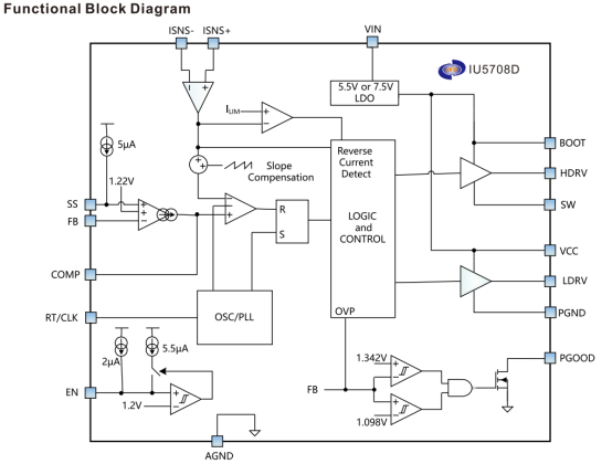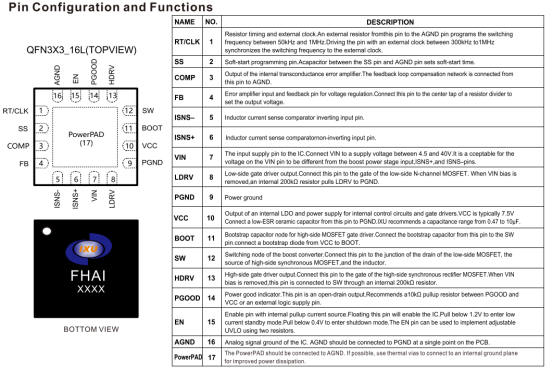功能与保护完善,EN脚内置2μA上拉电流源,浮空即可使能,支持可调欠压闭锁(UVLO),软启动时间通过外部电容可编程,避免启动电流尖峰。内置输出过压保护(输出设定值107%触发,105%恢复)、逐周期过流保护、160℃过热保护(20℃迟滞),内部斜坡补偿防止高占空比下的次谐波振荡。PGOOD引脚为漏极开路输出,可指示输出电压是否在设定值±10%范围内,VCC引脚提供6.6V LDO输出(最大50mA),用于驱动外部MOSFET。