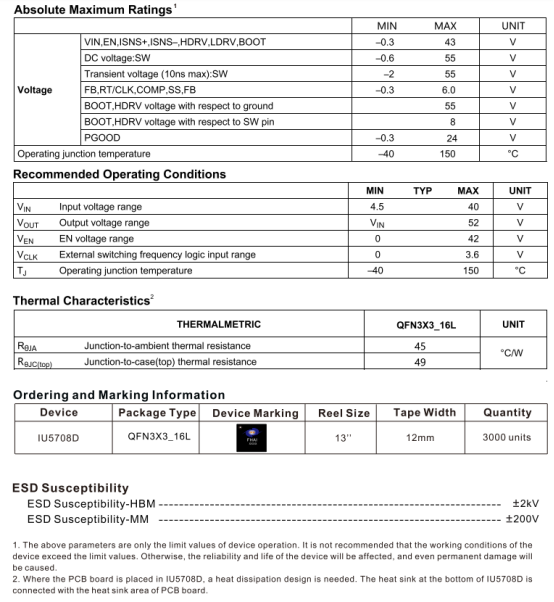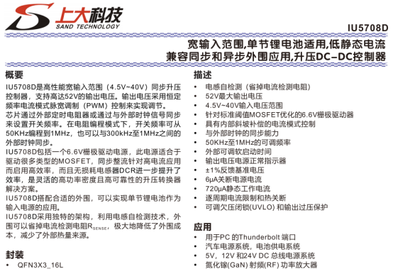 IU5708D是一款高性能同步升压DC-DC控制器,采用QFN3X3_16L封装,输入电压覆盖4.5~40V,最大输出可达52V,支持单节锂电池作为输入电源,兼容同步与异步外围应用,主打高功率密度、高效率与低成本,适用于PC Thunderbolt端口、汽车电源系统、GaN RF功率放大器、5V/12V/24V DC总线电源等场景。