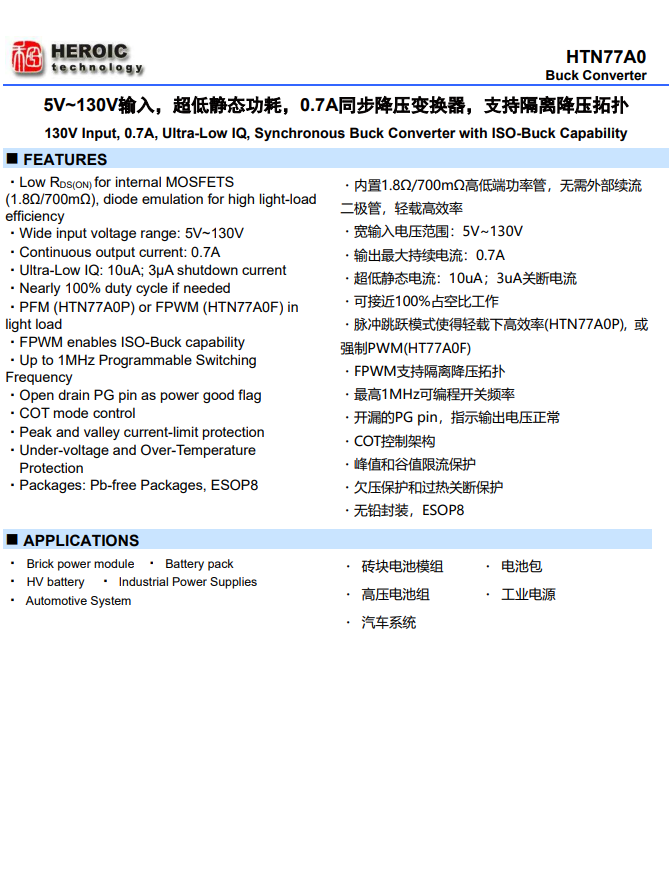 在工业控制、车载电子、物联网终端等多场景应用中,电源模块对宽输入范围、低静态功耗及高可靠性的需求日益严苛。HTN77A0 同步降压变换器以 5V~130V 超宽输入电压覆盖、10uA 超低静态电流及隔离拓扑支持等核心优势,为工程师提供高效紧凑的电源解决方案,完美适配复杂工况下的设计需求。