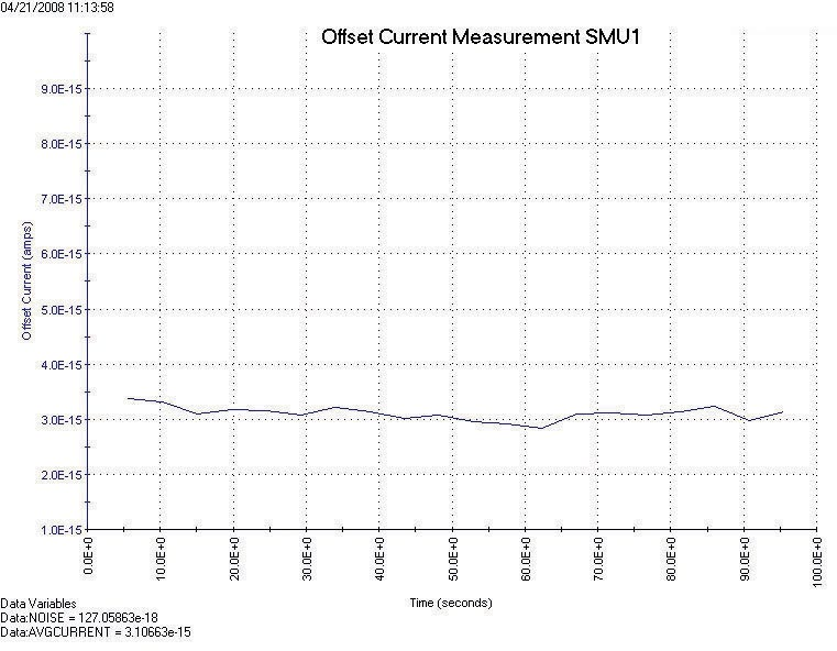 输入偏移电流规格可以通过在Clarius中执行自动校准程序来进行优化。执行SMU自动校准,请在“Tools”菜单中选择“SMU auto calibration”。在执行自动校准之前,至少需要开机预热60分钟。除了金属帽外,SMU的force HI和sense HI端子上不应连接任何东西。自动校准程序调整系统中所有SMU的所有源和测量功能中的电流和电压偏置。这里不要与全系统校准相混淆,应每年在授权的机构完成一次对4200A-SCS 的全系统校准。一旦执行了SMU自动校准,就可以对偏移电流进行重复测量。
