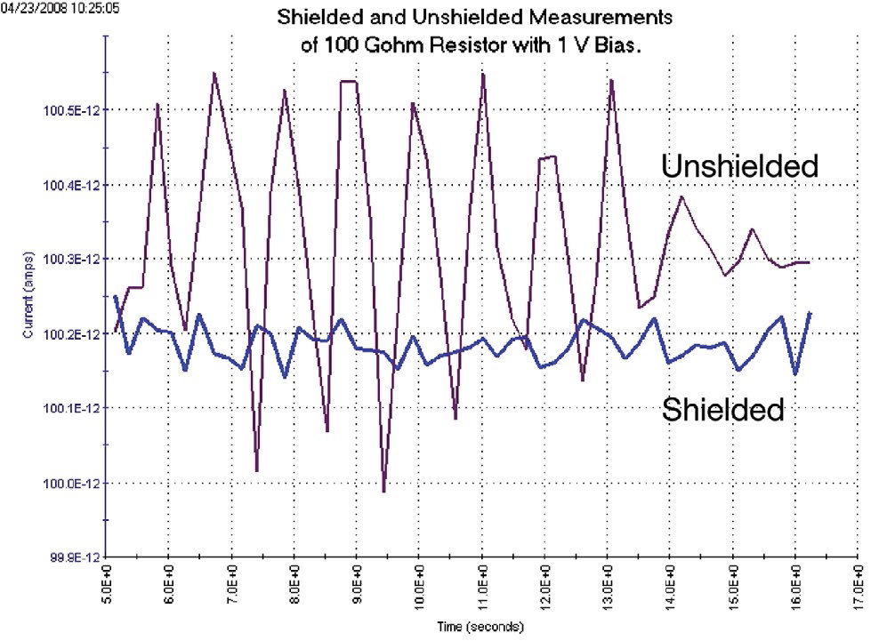 为了减少电场的影响,可以将被测量的电路封闭在静电屏蔽壳体中。图8说明了100GΩ电阻器的非屏蔽和屏蔽测量之间的巨大差异。未屏蔽的测量比屏蔽的测量噪声大得多。