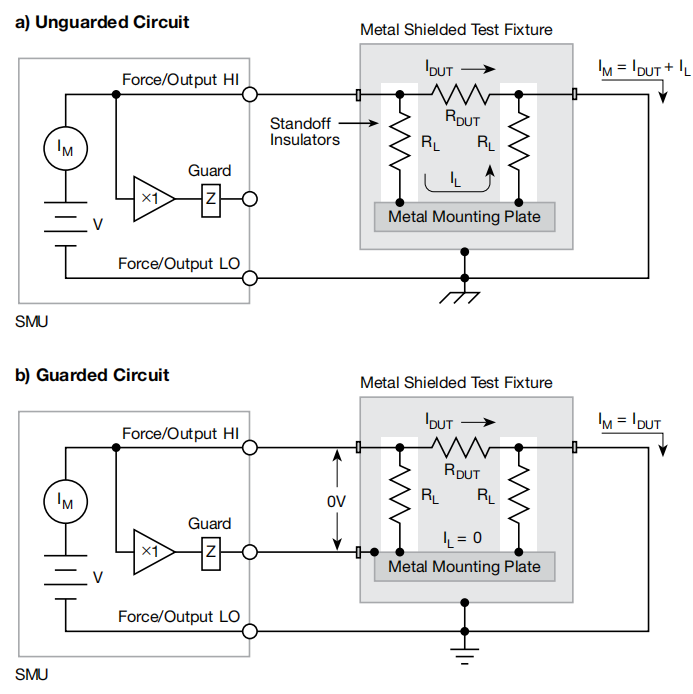 Guard不应与屏蔽混淆。屏蔽通常意味着使用金属外壳来防止静电干扰影响高阻抗测试电路。Guard意味着使用一个附加的低阻抗导体,与高阻抗电路保持相同的电位,它将拦截任何干扰电压或电流。Guard并不一定提供屏蔽。下面的段落概述了两个Guard的例子:1)使用Guard来减少由于测试夹具造成的泄漏,2)使用 Guard 来减少由于布线造成的泄漏电流。