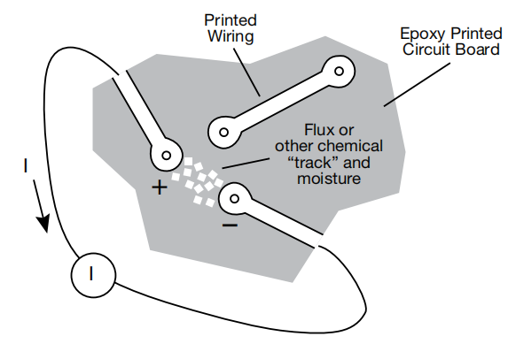高湿度或离子污染可显著降低测试夹具的绝缘电阻。高湿度条件下会发生冷凝或吸水,而离子污染可能是人体油脂、盐或焊料助焊剂的结果。绝缘电阻的降低会对高阻抗测量产生严重的影响。此外,湿度或湿气可以与任何污染物结合,产生电化学效应,从而产生偏置电流。例如,常用的环氧印刷电路板,当蚀刻液、助熔剂或其他污染物未被彻底清洗时,可在导体之间产生几nA的电流(见图17)。