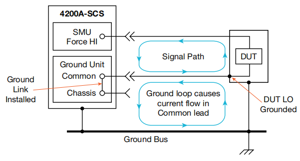 图18所示的配置显示了通过将4200A-SCS信号公共(Force LO)和DUT LO连接到地而构成的接地回路。回路中流过的大接地电流会遇到小电阻,要么在导体中,要么在连接点上。这个小电阻会导致电压下降,从而影响性能。