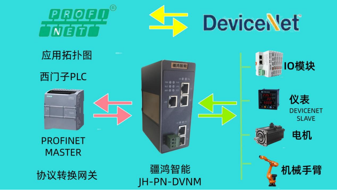 疆鸿智能JH-PN-DVNM型网关在Profinet一侧为Profinet从站,在DeviceNet一侧为Devicenet主站;