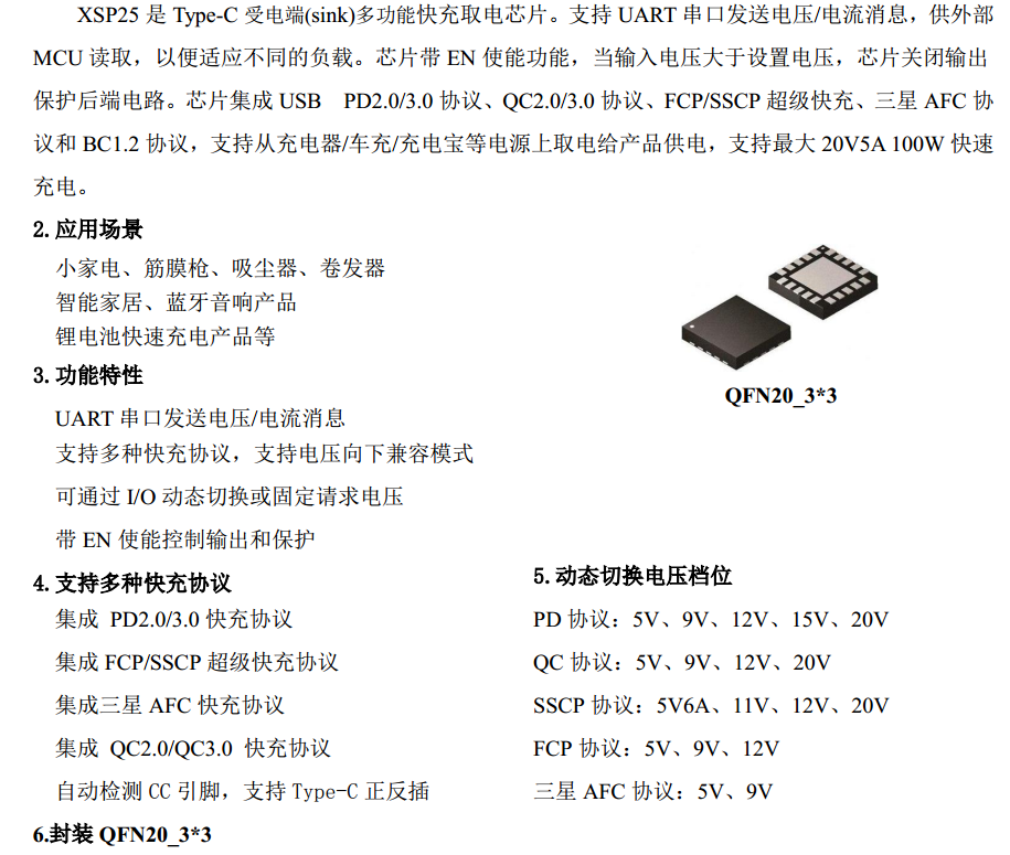 作为支持多功能的全能型诱骗芯片,XSP25采用QFN20_3*3mm小封装,集成了多项创新技术。