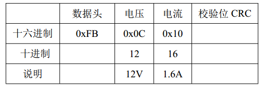 如上图: 0xFB 为数据头, 0x0C 为电压 12V, 0x10 为电流 1.6A。