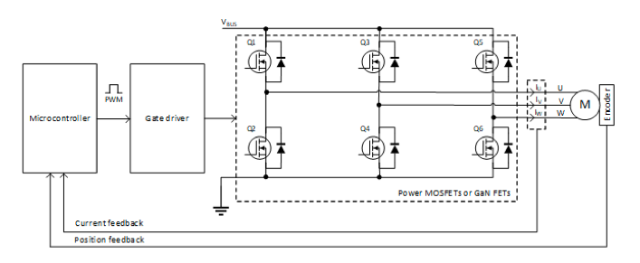 人形机器人中的电机必须以不同的速度和扭矩水平运行,这是通过磁场定向控制 (FOC) 等电机控制算法实现的。该算法在微控制器上运行,并将可变脉宽调制 (PWM) 信号应用于控制功率 FET 的栅极驱动器,如图 1 所示。
