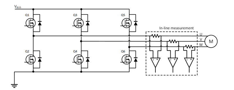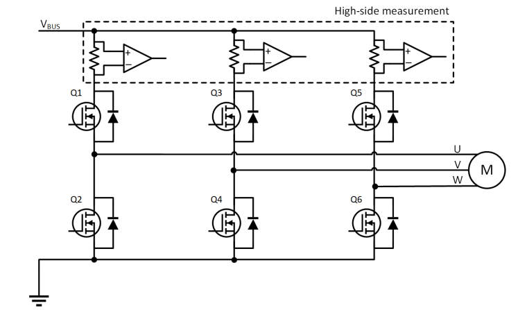 这是使用最广泛的电流测量方法之一,其中一个分流电阻器添加到电机的每个相位,如图 4 所示。