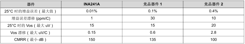 INA241A 是当今市场上精度最高的电流检测放大器,可实现更严格的控制环路。该放大器具有 -5V 至 110V 的共模电压能力和出色的性能,失调电压较低(最大值为 ±10µV)、增益误差很小(最大值为 ±0.01%),并具有高直流 CMRR(典型值为 166dB)。表 1 列出了与主要竞品的 INA241A 规格比较。