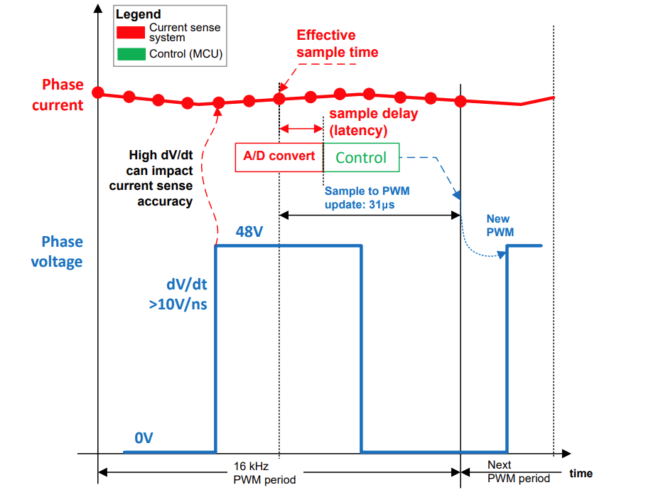 PWM 开关在相电流采样期间发生。因此,至关重要的是相电流传感器不受高共模电压瞬态干扰,并且不影响测量精度。图 8 显示了一个 PWM 周期内电机相电流之一和相应 PWM 电压的简化图表。