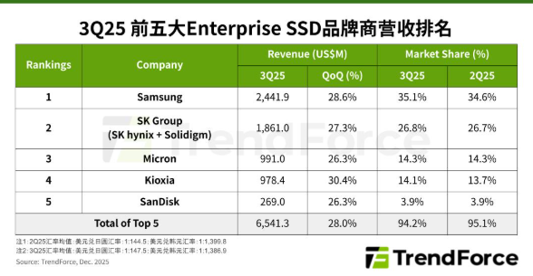2025年第三季Enterprise SSD(企业级SSD)市场迎来显著成长。根据TrendForce集邦咨询最新调查,受惠于AI需求快速从训练端外溢至推理端,以及北美云端服务业者(CSP)同步扩张AI基础设施与通用型Server建设,第三季Enterprise SSD出货量与价格强势上扬,前五大品牌厂合计营收季增28%,达65.4亿美元,创今年新高。