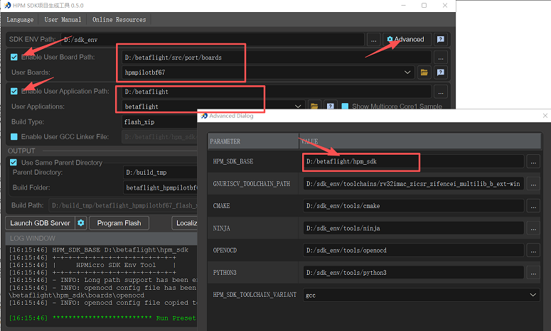 在windows环境下,下载使用sdk_env创建工程是最方便的git clone https://github.com/hpmicro/sdk_env.git打开sdk_env工具,在advance子界面配置HPM_SDK_BASE为betaflight目录下的hpm_sdk目录,并勾选hpm6754evk开发板,勾选Enable User Application Path,选择betaflight目录,单击Generate按键产生工程,然后打开SES工程。
