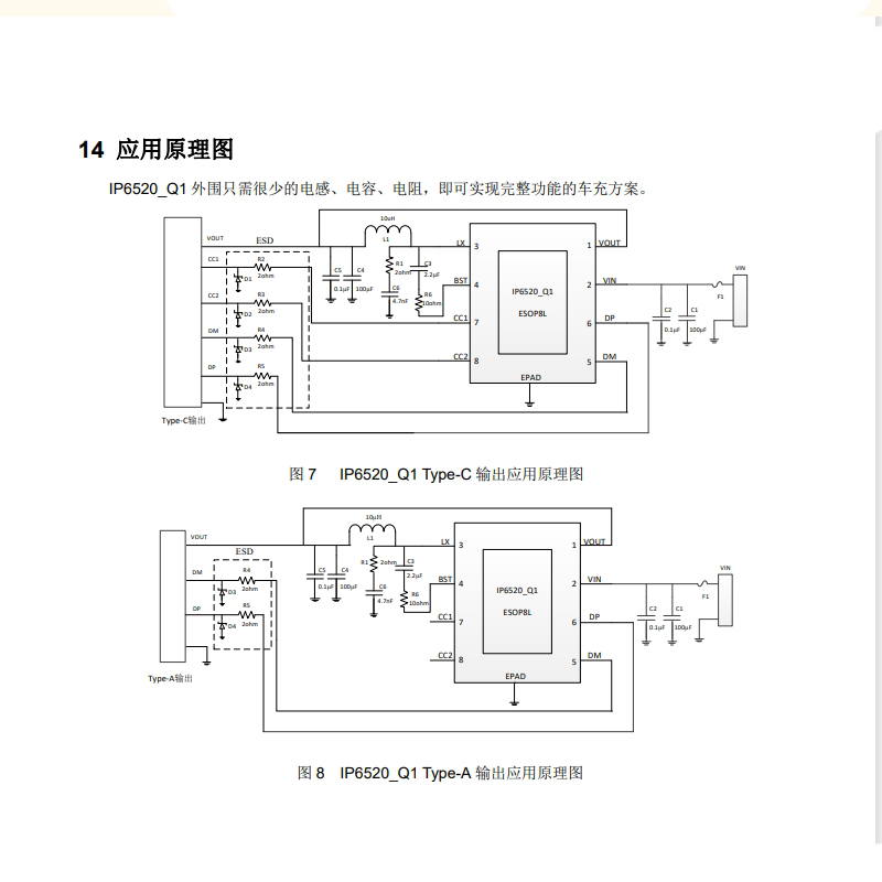 英集芯 IP6520_Q1是一款应用于车载USB Type-C PD充电器设计的车规级DC-DC降压芯片,符合AEC-Q100 Grade 2标准,在极端温度环境范围内(-40℃~+105℃)展现出了卓越的稳定性和耐用性。支持PD2.0/3.1、QC2.0/3.0/3+及Apple协议等大部分主流快充协议,提供最大36W的输出功率。输入电压范围7.3V~29.5V,输出电压范围3V~12V。内置功率MOS,简化外围电路设计,降低BOM成本。采用ESOP8L封装,体积小巧,便于PCB布局,适合空间受限的设计。