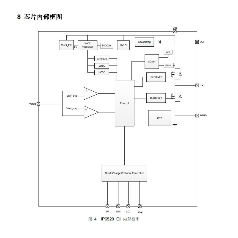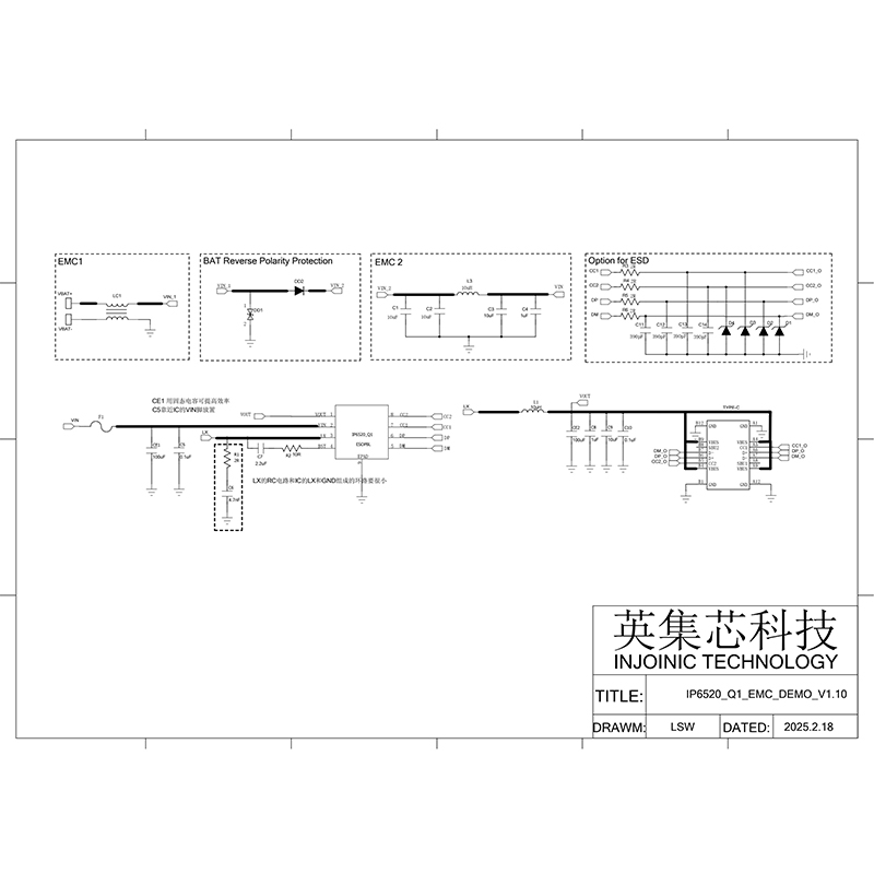 芯片集成输入过压、欠压、输出过流、短路、过温及DP/DM/CC过压防护,具备过热关断与自动恢复功能。其CC引脚耐压达30V,ESD防护等级为4KV,有助于在复杂电磁环境下保持稳定。在-40℃至+105℃温度范围内, IP6520_Q1_Q1型号通过AEC-Q100 Grade 2车规级认证,适应多种工况环境。