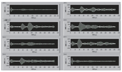 实验过程:本实验利用NACA0012翼型为模型,如b所示,整个翼型夹持在支撑台上。类似于平行布局,同样在一侧采用8个压电激励器另一侧8个接收传感器:在采集数据时,是一侧8个传感器依次发射信号,当某1个传感器发射信号时,平行线另一侧8个传感器接收信号。这样,当完成一个工作循环时,共采集8x8=64组数据,使用ATA-8202作为驱动源,使用泰克示波器提供信号,软件部分集成了信号发生控制、采集卡控制、信号检测、信号采集和结果分析功能五个模块。