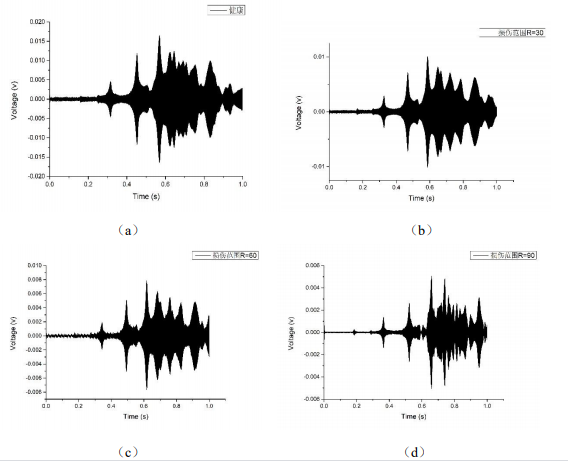 图c:信号时域图(图c分别代表(a)健康状况、(b)损伤范围为30、(c)损伤范围为60、(d)损伤范围为90时传感器接收信号的时域图)