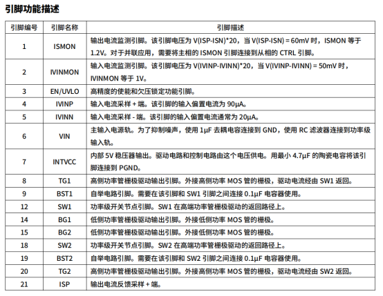 芯片支持 200KHz~700KHz 可调开关频率(通过 RT 引脚外接电阻设置,147K 对应 200KHz、59K 对应 400KHz、29.1K 对应 700KHz),也可通过 SYNC 引脚与外部时钟同步(100KHz~1MHz);具备恒压 / 恒流双调节功能,FB 引脚基准电压 1.2V,输出电压通过分压电阻调节(公式:V_OUT=1.2×(R5+R6)/R6),CTRL 引脚可线性控制输出电流(0~1.1V 线性范围)。此外,还集成输入 / 输出电流监测(IVINMON/ISMON 引脚)、C/10 充电终止、SHORT 输出短路指示等状态反馈功能,以及可配置输入欠压 / 过压保护、软启动(SS 引脚外接电容调节)、热关断保护(150℃触发,25℃滞回),防止启动过冲与过载损坏。