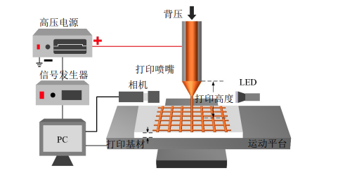 实验过程:高压电源输入端与信号发生器输出端相连,高压电源正极输出端与打印喷嘴(导电)直接相连,打印喷嘴上端连接有气压控制和材料供给单元,打印喷嘴下端放置打印基材,打印基材放置在X-Y向位移台上,计算机控制位移台运动以及CCD相机。