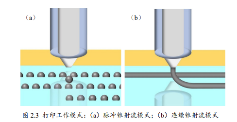 实验原理:用自激发静电场形成泰勒锥缩颈效应实现锥射流微喷射,并结合极化电荷吸引作用实现多层精准堆积,完成3D微纳结构增材制造。并且在打印原理分析的基础上,根据实际打印制造需求提出脉冲锥射流模式以及连续锥射流模式两种打印工作模式。