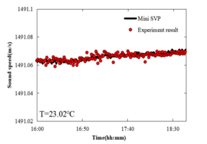 为了保证测得的超声波传播距离的准确性,使用气浮台确保水平状态。通过微调固定在平台上的反射镜M1和反射镜M2来实现两测量光路的平行。同时,调整反射镜M6在位移台上的位置,以使参考光路和测量光路具有相同的光程差。同理,调整了反射镜M7在位移台上的位置,并使用分束镜BS1(将频率梳分为两个垂直光束。光束进入双迈克尔逊干涉仪,两个测量光路被声波连续调制,利用光电探测器PD接收干涉信号。在实验过程中,在水箱中放置了温度传感器,盐度传感器和声速传感器,以实时监测温度和盐度。将测量结果与声速传感器进行比较,以验证该方法的准确性和可行性。