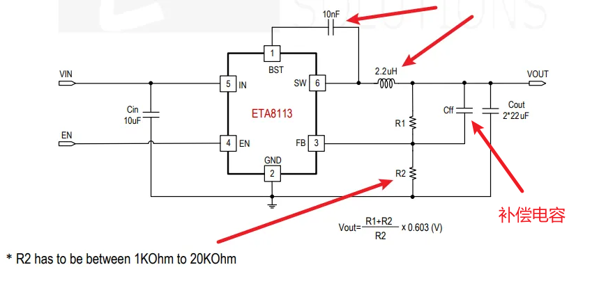 精准选择补偿电容(FB采样分压上电阻并联的电容):常规选型范围在10pF~100nF,若输入与输出压差较大时啸叫,可适当增加补偿电容值,但不能太大(否则影响动态响应),除非数据手册明确说明不需要;