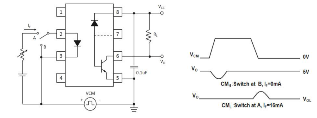 ▲晶台光耦KL6N136瞬态抗扰度测试电路及波形