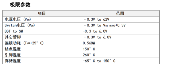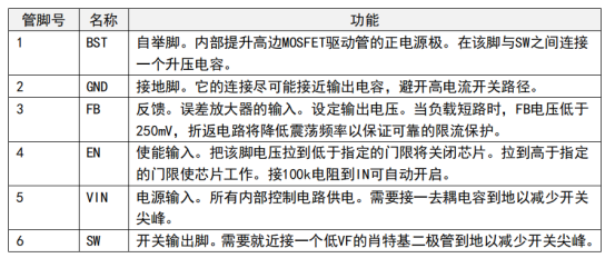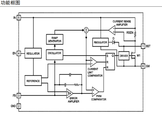 采用6引脚SOT23-6L封装,工作结温覆盖-40℃~125℃,存储温度-65℃~150℃,适配多种严苛工作环境。内部功率MOSFET导通电阻1Ω,静态电流典型值0.73mA,关机电流低至0.1uA(最大1uA),极大降低功耗,尤其适合电池供电场景。具备完善的保护机制,包括逐周期过流保护(极限电流典型值1.5A)、165℃热关断保护、输入欠压锁定,其中欠压开启阈值典型值3.3V、关断阈值3.05V,负载短路时FB电压低于250mV会触发频率折返保护,保障器件安全稳定运行。