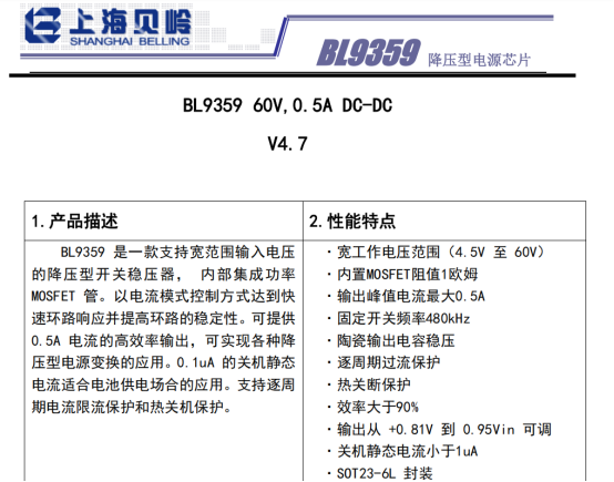 上海贝岭BL9359是一款内部集成功率MOSFET的降压型开关稳压器,采用电流模式控制,具备快速环路响应和高稳定性,适用于高电压功率转换、智能电表、汽车系统、工业电力系统、分布式电力系统及电池供电系统。芯片输入电压范围4.5~60V,输出峰值电流0.5A,输出电压可从0.81V调节至0.95倍输入电压,固定开关频率480KHz(实际范围380~580KHz),效率超过90%,性能表现优异。