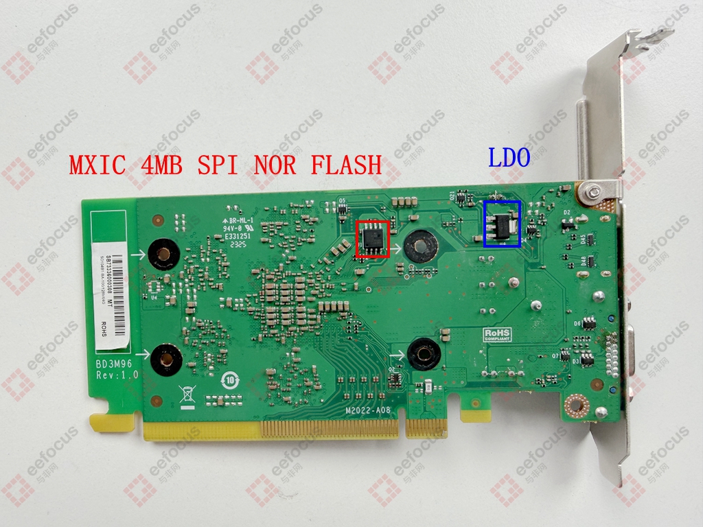 The back of the S10 graphics card mainly features two components: one is a 4MB SPI NOR FLASH from Macronix , model MX25U3232FM2I02, used for storing system firmware; the other is an LDO, providing stable power to the board.