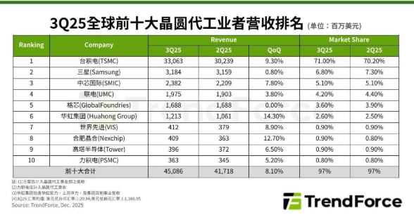 2025年第三季全球晶圆代工产业持续受AI高效能运算(HPC),和消费性电子新品主芯片与周边IC需求带动,以7nm(含)以下先进制程生产的高价晶圆贡献营收最为显著,加上部分厂商得益于供应链分化商机,推升前十大晶圆代工厂第三季合计营收季增8.1%,接近451亿美元。