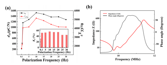 图2:(a)PIMNT晶体的压电系数、相对介电常数和机电耦合系数随ACP极化频率的变化(@10kV/cm和10cycles),(b)ACPPIMNT单晶的阻抗(@10kV/cm和15Hz)。