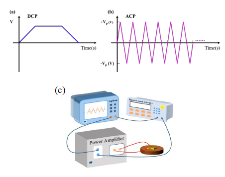 图1:(a)直流极化示意图,(b)交流极化示意图,(c)交流极化装置
