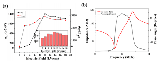 图3:(a)PIMNT晶体的压电系数、相对介电常数和机电耦合系数随ACP极化电场的变化(@10Hz和10cycles),(b)ACPPIMNT单晶的阻抗(@10kV/cm和10cycles)。