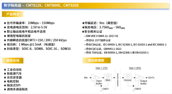 此外,CMT812X(2通道)、CMT804X(4通道)与CMT826X(6通道)系列标准容耦隔离器还采用了先进的电路技术,能够以较低的功耗实现高电磁抗扰度,并最大限度地减少由于高频载波和I/O缓冲器切换引起的辐射。
