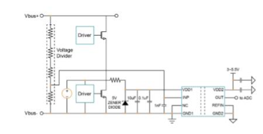 单端输出隔离电压采样应用电路图(无需后级运放)