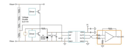 差分输出隔离电压采样应用电路图(橙框内为运放)