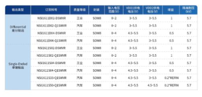 NSI1611系列包含差分输出的NSI1611D和单端输出的NSI1611S。其中,差分输出均为固定增益,单端输出则提供固定增益和可调比例增益两类选项,进一步满足不同系统架构与设计需求。