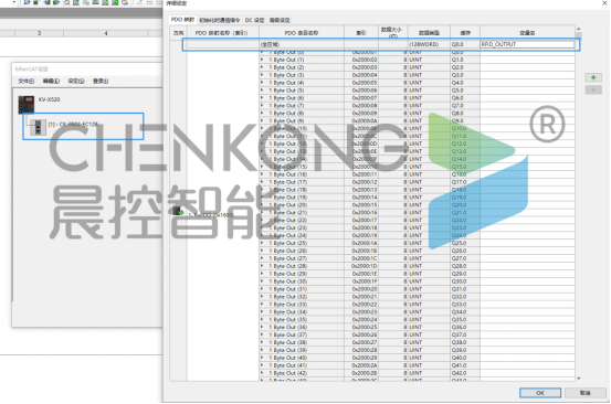 点击设备,在PDO映射中,输入输出变量的全区域变量名中,分别填入输入输出数组变量名