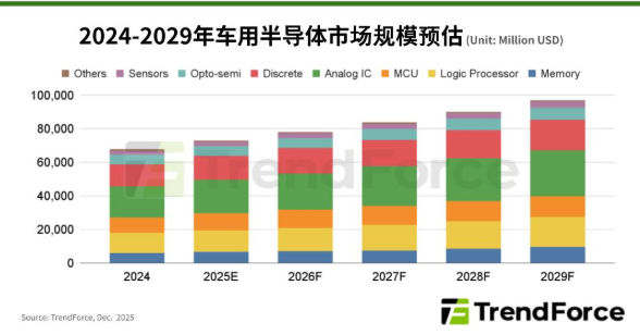 随着汽车产业加速电动化、智能化进程,预计将推升全球车用半导体市场规模从2024年的677亿美元左右,稳健增长至2029年的近969亿美元,2024-2029复合年增长率(CAGR)达7.4%。