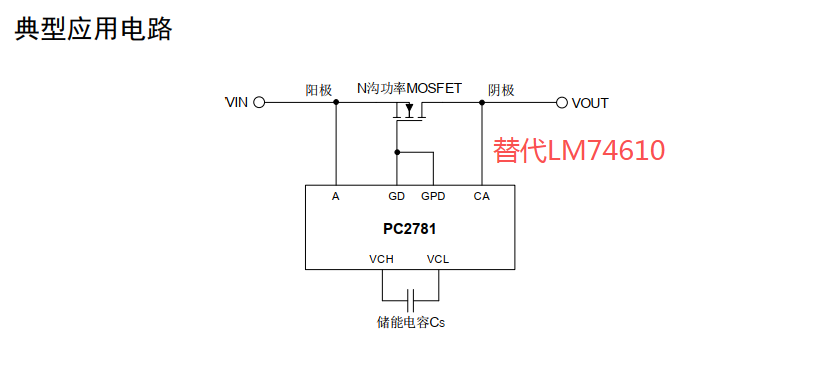 PC2781 是高边驱动控制器配合 N 沟道功率MOSFET 控制器, 在应用时与外部 N 沟道功率MOSFET、电容储存器共同使用,实现二极管电路功能,该二极管电路在串联电流源时具有低平均正向导通电压,反向低漏电流特性,可应用于组件级光伏电源系统中作为防反或旁路保护器件。产品内部集成电荷泵、参考比较器、反偏检测及功率 MOS 驱动电路等单元。