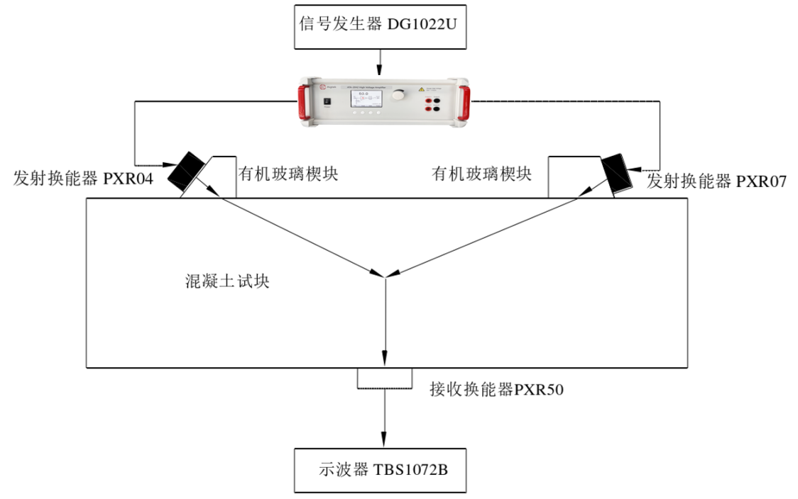 实验原理:功率放大器驱动两组有夹角的超声换能器,超声换能器产生两列入射超声波,超声波在材料中传播。两组入射波和材料内部结构相互作用产生非线性的谐波、通过分析非线性谐波,可以提取材料的性能信息,通过对比理论数据就可以检测出混凝土材料中是否存在缺陷。